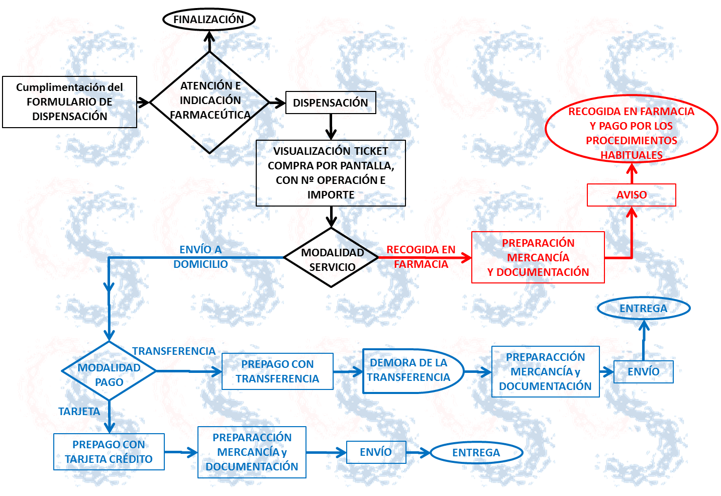 En el caso de "prepago mediante transferencia bancaria", el paciente realizará la transferencia bancaria a la cuenta que se le enviará por mail, incluyendo como referencia del pago el número indicado en ella. Una vez comprobado el pago, la farmacia preparará el pedido y lo empaquetará adecuadamente para que el transportista lo entregue al paciente en su domicilio en las debidas condiciones de seguridad, con lo que finaliza el proceso de dispensación. Junto con los medicamentos se entregará tanto la factura / ticket físico, como la documentación que sea necesaria para la adecuada utilización del medicamento. Es importante indicar que, en el caso de transferencia bancaria, el periodo de entrega de los medicamentos (36h) no comienza a descontarse hasta que se reciba la transferencia que, en algunos casos, puede demorarse hasta dos días.